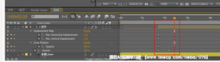 11 、在项目窗口中将“文字”合成拖入“完成”合成中,将时间起点设置到1秒17帧位置,为“文字”层的Opacity属性设置关键帧动画,在1秒17帧处设置值为0%,在2秒04帧处设置值为100%,如图11所示。