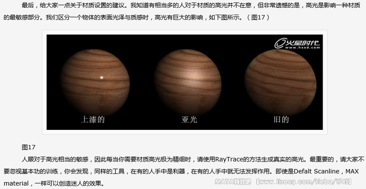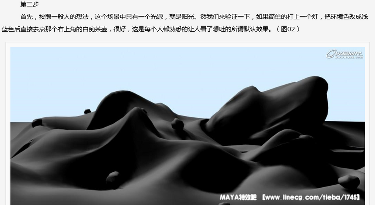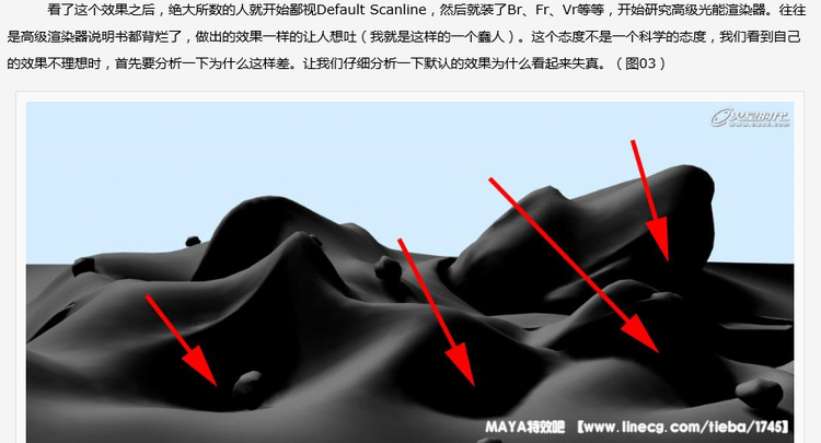 图3中标出的地方就是为什么这个图看起来失真的第一个原因:在现实生活中,物体的背面不可能是这样深的一致的黑色,一方面,来自周围物体的光线会反弹到这些暗的区域,另一方面,在户外场景中,真实的情况是,阳光进入大气层后,会出现散射的情况,这样,在所有的户外场景中,都有天空光的存在。天空光是一种方向随机的光线,在max中提供了Light Tracer这样的插件进行模拟。而高级渲染器则几乎都提供了这样的天空光模拟。这个场景只是使得正对面的表面被照亮,更接近于在月球等没有大气散射的星球上的情况。关于光线行为的知识,建议新手们找本书研究一下,其实高级渲染器的说明文件也是不错的。