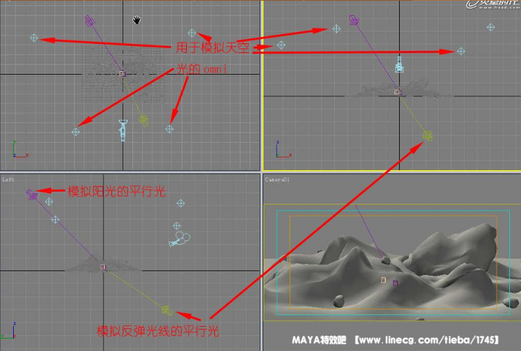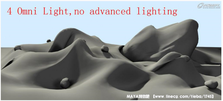 在本场景中,我们用四盏omni来模拟天空光。这是要一点技巧的工作,但是,如果你很不愿意手调的话,用一个半球形的灯光阵列就可以了,灯越多,效果越均匀,但是计算时间越多(但比起变态的GI计算,这个几乎可以说是不花时间)。有四项需要注意: