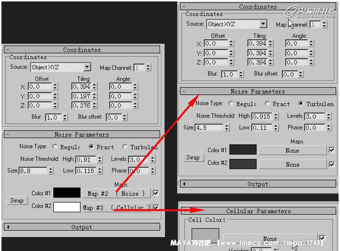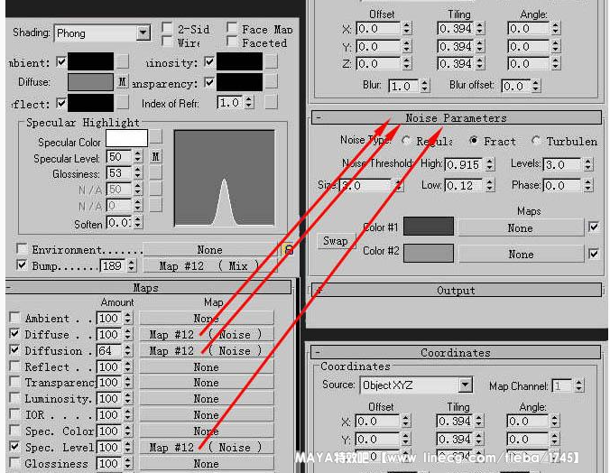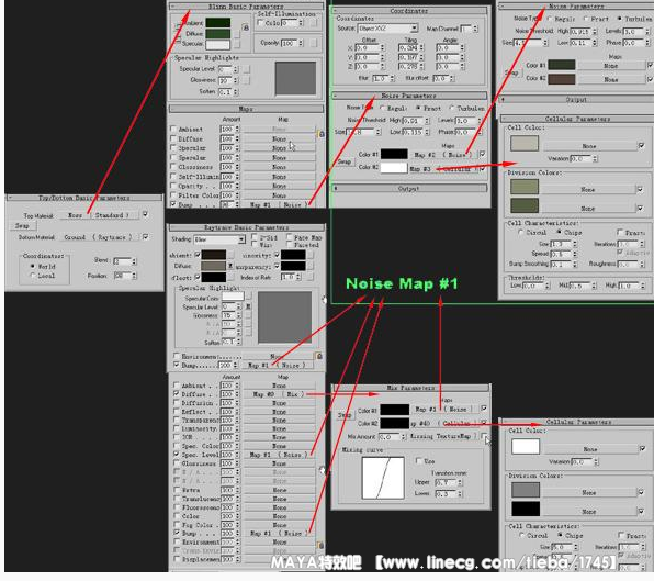 首先在bump通道建一个Noise map,钩选Fractal选项,把Size值设小一些以获得更多的细节。把Noise Treshold的最大值和最小值设的比较靠近以增加对比度。现在还不用担心更小的细节,因为我们会在这个Noise下面再嵌套一个noise map。现在点我们的noise map的黑色方块,再给他一个noise map。这个贴图的size值应该更小以便于创造更多的细节,把这个贴图的类型改成Turbulence,这样最终的结果会更有趣。把这个贴图的颜色设成暗灰色。现在退回到我们的最初的noise下面,点白色的按钮,给他一个 Cellular map,把size值改小并且把类型改成Chips。然后把bump通道的输出值改成100。