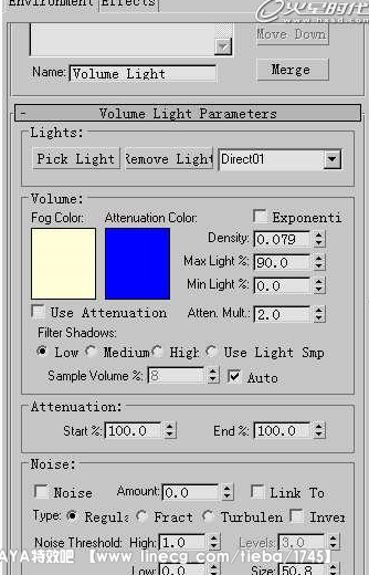 现在接近完成了,这一步要加入一些渲染后效果,如体积光,lens effects,Film Grain等效果。注意Film Grain的值设成0.2,Lens effects中加入Glow特效,体积光设置如下图。(图15)