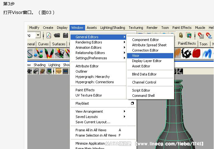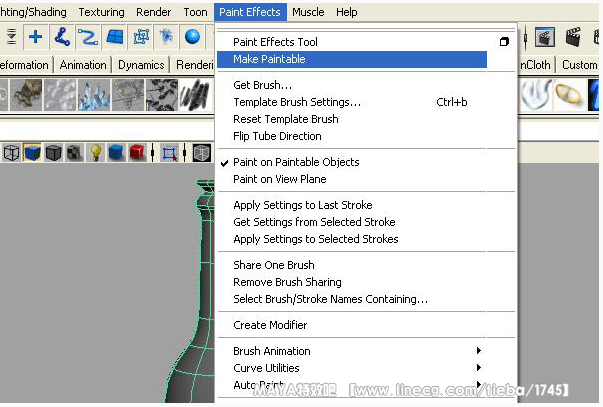 切换到“渲染菜单”,按“F6”键,选择Paint Effects菜单,选择Make Paintable。 (图02)