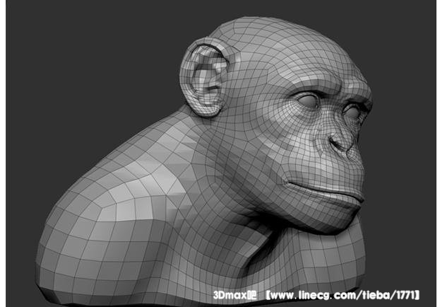 模型是在3ds Max里面完成的,画基本模型用的时间不多,主要是布线的要求。大型如果有问题可以在ZBrush调整,模型的布线最好是依靠角色的肌肉结构来制作。这样能比较好的突出角色的结构,也利于之后在ZBrush里雕刻。在模型上尽量用4边面来完成,不用5星点,或者是把5星点放在细节不是很多的地方,避免将其用在像眼睛和嘴巴周围等经常要运动的和细节较多的地方。(图02)