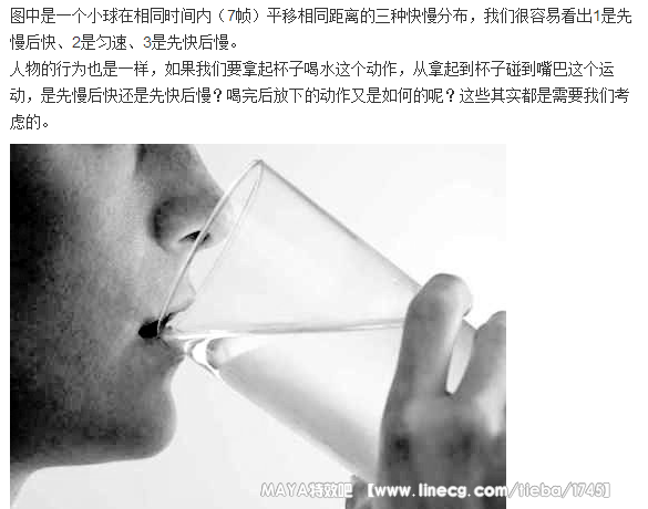 其实要找到快慢变化的原因,只需理解那都是思维判断的结果,或者我们可以干脆把先慢后快或者先快后慢直接替换成“先想慢后想快”和“先想快后想慢”这样去理解。比如还是刚才喝水的例子,要判断其中拿起的动作是什么样的快慢变化,就要去理解角色心里所想,刚拿的时候可能想的是要拿稳,拿起后想的是要快点喝,而快到嘴边了想的又是不要撒出去,有了这些对角色行为想的判断,我们就可以放心地体现在动画中了,其实也就是先慢-再快-最后慢的快慢变化。