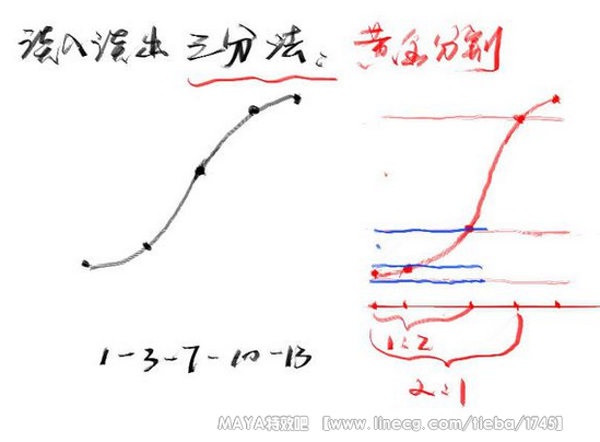什么是三分法?就是把可能产生变化的位置作为中点,然后变化前到中点与中点到变化后的比例尽量为1:2或2:1,也就是0.3333:0.6666,较大部分与整体的比值比较接近黄金分割的0.618。那么图示的例子中左边黑色部分是原始曲线,没有明显的快慢变化,右侧红色部分是调整后的,我们把7的位置下移,让它更慢使得1到7的位移距离大致为7到13的位移距离的一半,然后需要再细化一点的话3的位置也可以下移,同样是满足前是后的一半即可。这种方法并不是万能的,但大部分情况又用起来简单有效,可以一试。