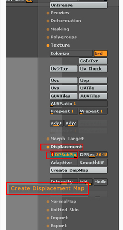现在开始制作 displacement 和 bump 贴图。displacement(置换)贴图:当前模型为 cage(框架)模式、细分等级1,进入 tools - displacement - subpix,设置2-4左右的像素细分值,数值越高,贴图越精确,计算时间也越长,我通常选择4。贴图尺寸默认为1024,为了得到更精确的结果,我们将它提高到2048。屏幕上方会有提示告诉你生成贴图的计算时间。