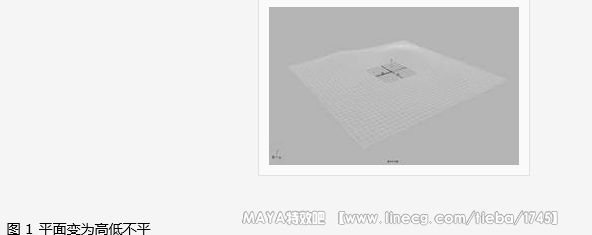 海滩造型及材质 1 、建立一个平面;在通道箱中设置 "scale x" 和 "scale z" 为 100 , "patches u" 和 "patches v" 为 10 ,增加平面段数; 2 、选中平面后按数字键 3 以高分辨率模式显示平面。切换到 "modeling" 模块,点击 "edit nurbs→sculpt faces tool" ,打开 "tool settings" 窗口; 3 、 在 "tool settings" 窗口中 "radius(u)" 控制笔刷大小, "opacity" 设置笔刷的施力大小,在 "operation" 中 "push" 为挤压, "pull" 为拉伸, "smooth" 为平滑, "erase" 为消除。利用笔刷勾画,使平面高低不平(如图 1 ); 4 、打开 "multilister" 窗口;点击 "edit→create" 命令,在 "create render node" 窗口中的 "materials" 下点击 "lambert" 按钮,建立 lambert 阴影组,关闭该窗口; 5 、在 "multilister" 窗口中双击新建立的 lambert 阴影组,在弹出的窗口中的 "lambert2" 点击 "color" 右侧的按钮,在 "create render node" 窗口中点击 "solid fractal" 按钮; 6 、在 "solid fractal1" 下展开 "solid fractal attributes" ,设置 amplitude 为 0.5 , frequency ratio 为 5 ,展开 "color balance" ,点击 "color gain" 后面的颜色块将颜色设置为 h=40 、 s=1 、 v=0.5 ;点击 "color offset" 后面的颜色块将颜色设置为 h=40 、 s=0.8 、 v=0.7 。切换到 "place3dtexture" ,将 "scale" 的三个数值都设置为 20 。回到上两级材质;