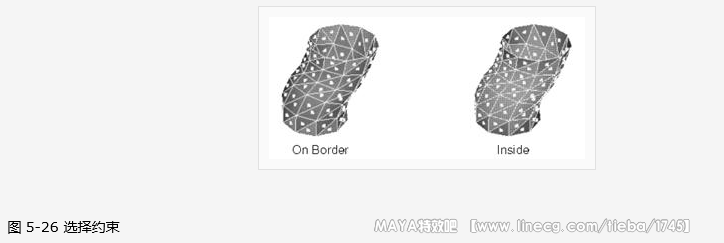 3. 约束选择 在 selection 子菜单的底部是 selection constrains 命令,它是一个高级工具,下面是这个工具的某些功能: ● 可限制选择的特定区域,例如边界组件或内部组件。 ● 可以仅选择硬边或仅选择软边。 ● 可以仅选择三角形面、或四边形面或其他多边形面。 ● 可以随机选择组件。 ● 可以扩展或缩小选定的区域,或者选择选中区的边界。 图 5-26 是一些多边形约束选择示例。或许已经注意到 n 边形表面看起来像四边形或三角形,很容易将两者相混淆。但数一下它的顶点或边时,便会发现 n