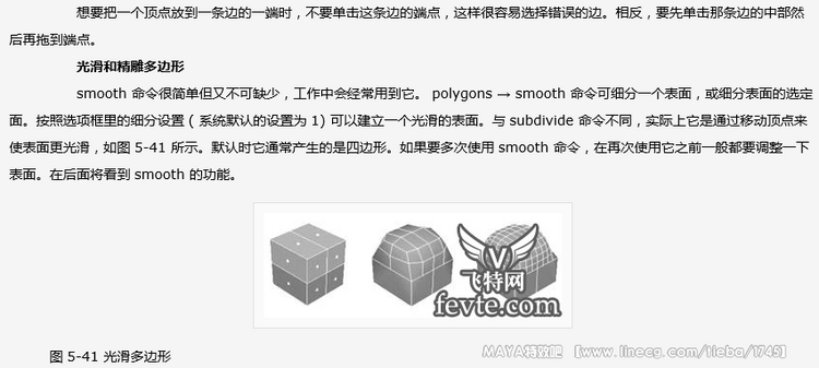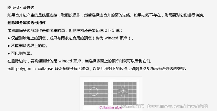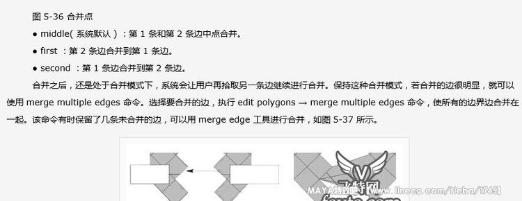 命令是合并,而不是将很多的点重叠在一点上,只有一个顶点为多条边所共享。通常,只有在移动边或面时,才能清楚它们之间的区别,如图 5-36 所示。 edit polygons → merge edge tool 命令的功能是合并边界上的边。当选择了这个工具时,边界上的边就会变粗,单击第 1