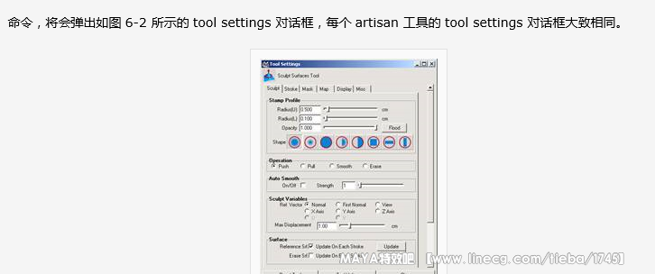 本教程向朋友们介绍maya 7.0 artisan建模之表面雕刻画笔工具,对于表面雕刻画笔工具 (sulpt surfaces tool) 而言,它具有 4