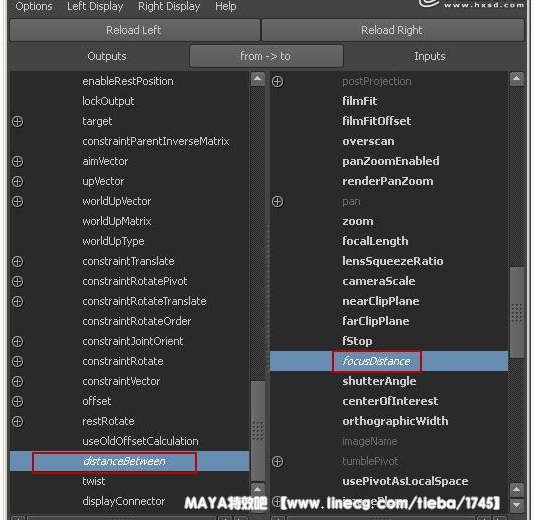 制作镜头景深 9.在前面制作葡萄的教程中有网友留言问关于景深的问题,在这里我使用maya的摄像机做景深的效果。创建一个两点摄像机,并对摄像机的属性进行连接,执行windowgeneral editorsconnection editor(窗口常规编辑器关联编辑器)命令,打开关联编辑器,将camera1_group导入到输出列表中,将camerashape1导入到输入列表中,属性的连接如下图所示。