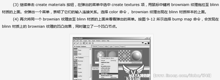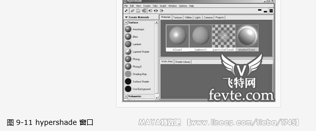 (2) 执行 window → rendering editor → hypershade 命令打开 hypershade 窗口,单击窗口左侧的 create textures 按钮,在弹出的菜单中选择 create materials 选项,用鼠标中键将 blinn 材质拖拉至 hypershade 窗口右侧的选项组中,如图 9-11 所示。