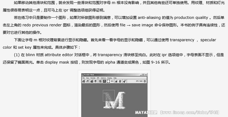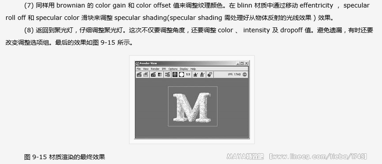 maya 7.0 渲染基础-制作基本材质本节通过使用 hypershade 窗口给字母 m 加上阴影。与在 render view 窗口中一样,在 hypershade 中可以使用热键或鼠标按钮对字母进行缩小、放大和移动。还可以通过 visor 面板及中心渲染文件浏览器来进行缩放。开始时可能有点不自然,可是能清楚地看见阴影操作时所需的样本和状态。在本例中,并不过多地解释各种设置,只深入探讨阴影和纹理。具体操作步骤如下: (1) 打开 render view 窗口,在视图中调整聚光灯直到对其照射的字母 m 满意为止。当正确地给字母加上阴影后,回到该视图再仔细调整灯光。