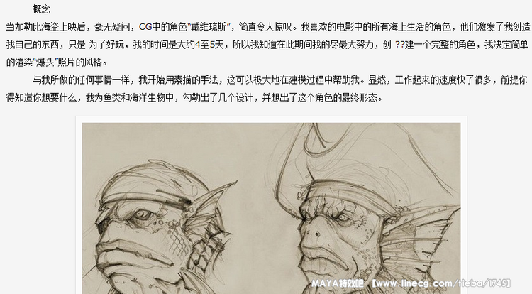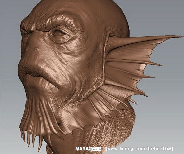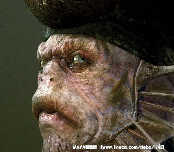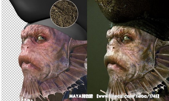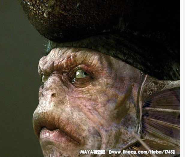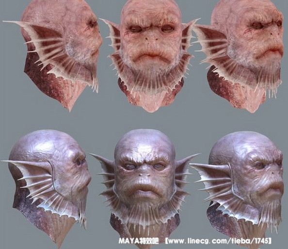 合成和最后润色这里我偷巧了,我想在有限的时间内完成这幅画,而不是一个转盘动画,所以我使用了一些技巧,以最大限度的影响整幅作品:直接在帽子上绘制纹理贴图,非常像投影画或Matte Painting。我搜集了一些鱼鳍图片,剪切下来放置到合适的位置,并创建一个模糊景深的效果,这种方式创建的角色看起来更像一具尸体,它的样子也更加让人信服。