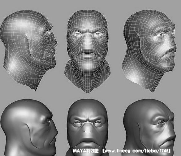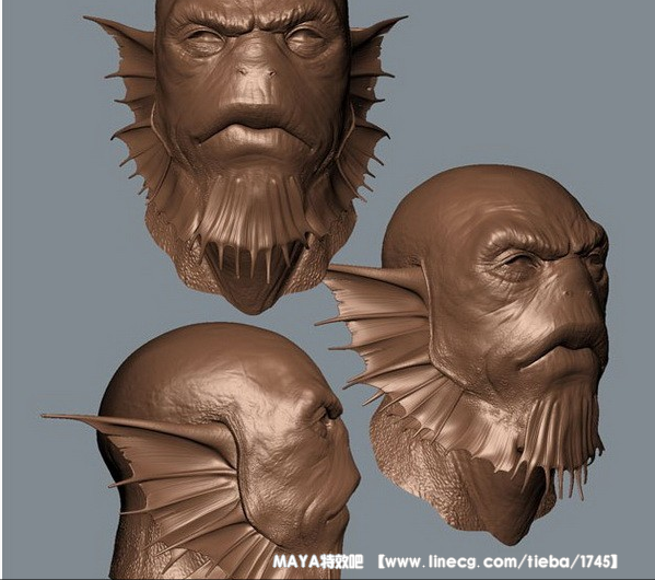 然后导出obj格式到ZBrush中,雕刻老化的皮肤和额外的细节(Mudbox中也可以),本例中我是用的是Mudbox ,最后我烘培出displacement map、AO和cavity贴图。
