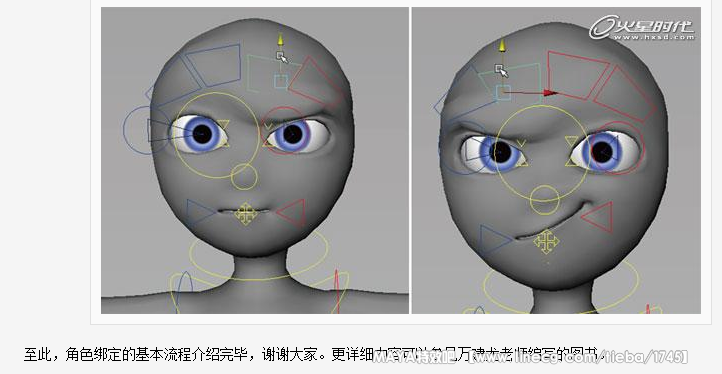 最后还要为脚部定义全局脚本命令,以及实现右键的菜单功能。我们这里只讲解人物角色绑定的流程,涉及到更多的知识点大家可以参阅其他文章。六、面部绑定面部的绑定的主要原理与身体绑定是相同的,一般放在身体绑定之后进行。它包括骨骼的设置、人物权重绘制、表情的制作、控制器的添加、次级控制器原理以及次级表情制作等内容,绑定效果如下图所示。