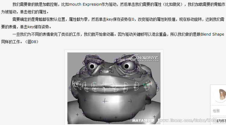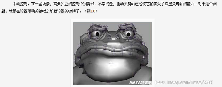 优点:1、骨骼是弧线方式动画的,Morph是直线的。2、骨骼可以加载额外的控制器,可以手动移动脸部的不同处。3、动画师只需调整骨骼就可以控制脸部,而不是脸上的多边形。4、骨骼更容易控制脸部体积。如果采用Morph就要确保脸部保持体积和拉伸。缺点:1、制作时间慢。2、不好制作细节,比如皱纹的动画。3、骨骼的文件大。由于这个青蛙嘴部太大,所以我们使用了骨骼来进行创建更好一些。(图03)