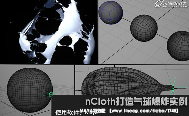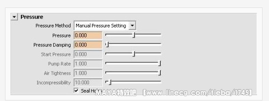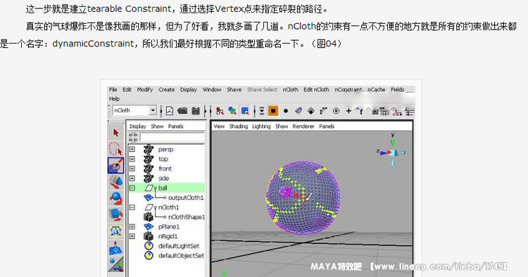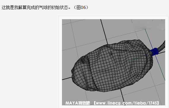 当完成tearable Constraint以后,我们要考虑一件事情,什么时候tearableConstraint会发生作用。当我们施加了T.Cnstraints以后,在解算的第一帧,Maya便完成模型的分割,根据glueStrength的数值来决定布料对于外界施加力的“灵敏度”,glueStrength数值为0时,布料一旦开始解算就会分裂,相反为1时,布料不会分裂(glueStrengthScale==1)。所以,我们可以用两种方法A:通过多次解算,尝试出一个数值,使布料在某一时刻点破碎,或某一次碰撞强度下破碎。B:直接在glueStrength上加关键帧动画,在需要布料破碎的那一个点上,把数值打到0,这样布料就瞬间破碎了。对于气球的爆破,B方法最合适不过了。决定了爆破的方法,下面的事情就很简单,让气球充气变大,上浮,爆破(glueStrength=0)。因为这里使用Manual,只有两个属性,Pressure就是Pressure,没什么多解释的,数值大内压高,模型就鼓起来,负值就是内压逃逸了。(图07)