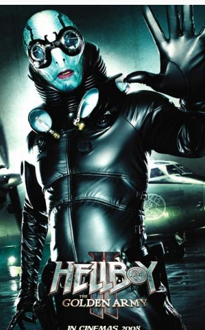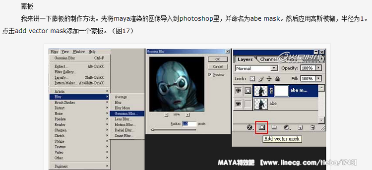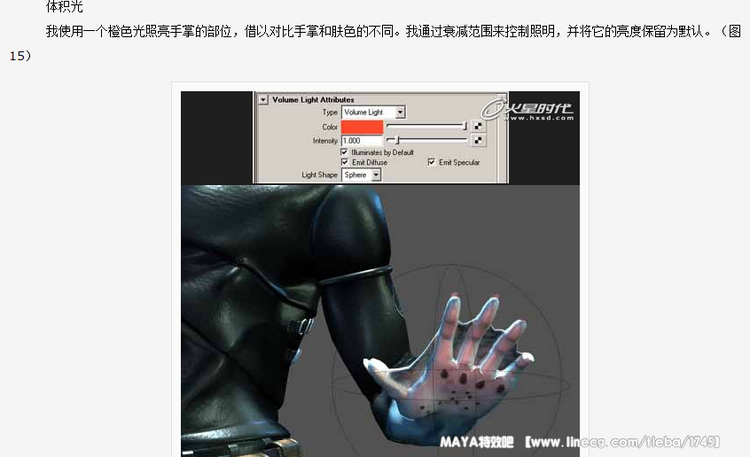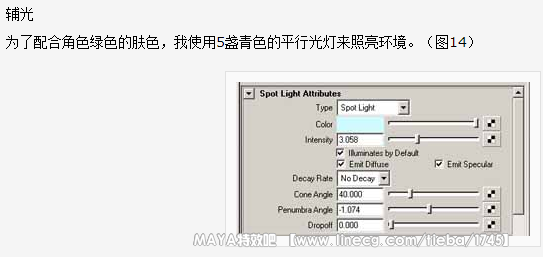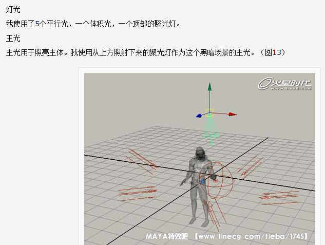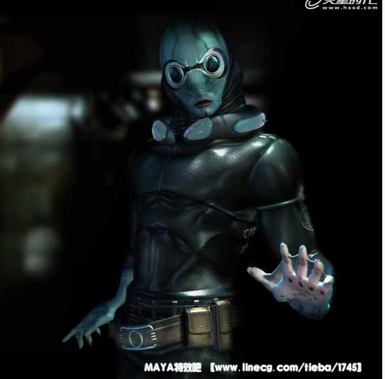 所以在陆地上必须穿着一套呼吸设备。总之,角色是整体建模,然后加上装备,最后在 Photoshop里添加背景。这个角色属于聪明机智的类型,它的动作姿态参考了电影。为了符合电影中漆黑的环境和明亮的角色那种对比的感觉,在角色上方放置了一盏聚光灯,就好像光从水面上照射下来。关于脖子上装满水的呼吸系统,将在后面介绍如何制作它那种里面有水的材质效果。影片中的鱼人角色