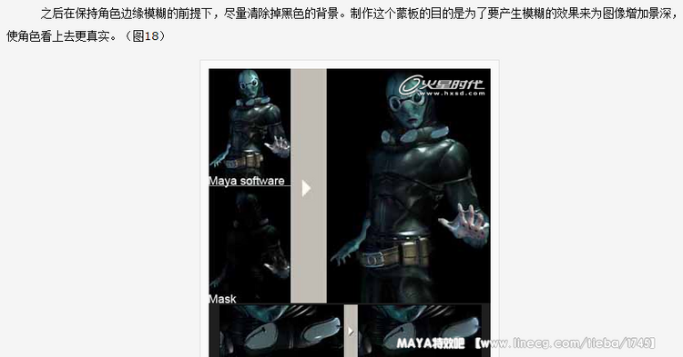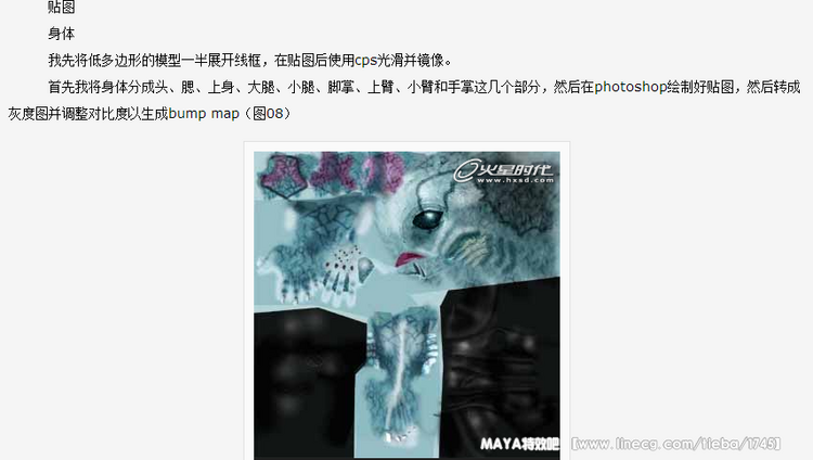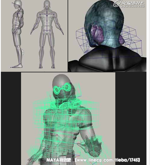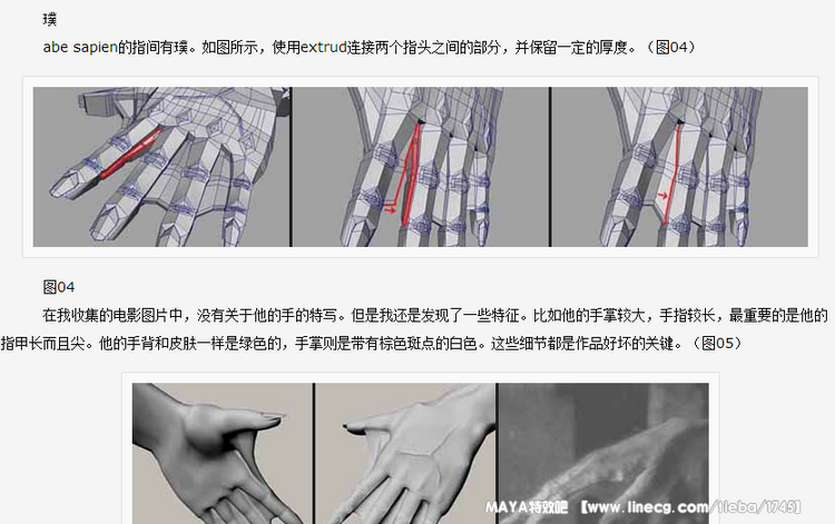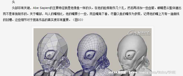 具体的制作步骤如下:建模在建模前要了解一个人的站立姿势。不管是男人还是女人,为了保持平衡,他们从侧面看应该是一条曲线而不是直线。了解这一点后,就可以开始建模了。我采用一个多边形方块从整体到局部的建模方式,整个建模工作都是在Maya中完成,没有使用类似ZBrush之类的建模软件。另外,收集一些相关图片作为参考也是非常必要的。首先做出基本形态,然后CPS并镜像。在制作完整体的形状后,就可以开始根据照片来做细致的建模了。(图01)
