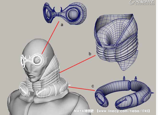 装备大部分装备使用了nurbs建模,尤其是呼吸器使用nurbs成形非常方便。(图06)a、眼珠单独建出,并和眼罩结合到一起。眼罩的两根金属支架单独建出。其余是整体建模。