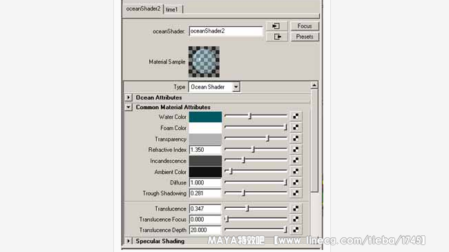 ocean shaderwave length mix/max:用于调整波长的最小和最大值。wave height:使用曲线控制波的高度。横轴表示波长,纵轴表示波高。wave turbulence:使用曲线控制波的紊乱度。wave peaking:使用曲线控制波形。数值越小越平滑,反之亦然。foam emission:生成波浪上的泡沫。泡沫只是通过颜色表现出来,并不会产生真正的泡沫形状。common material attributes:调节波浪和泡沫的颜色、透明度、推进效果以及其它一些属性选项。(图10)