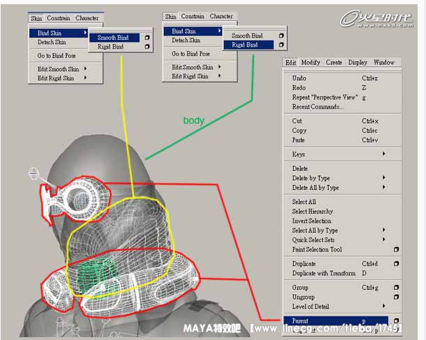 绿色:因为是人类的身体,所以使用rigid bind模式绑定。因为在绑定后,骨骼就会对模型产生作用,因此在之前就要将flexor准备好。黄色:因为脖子上的装备有柔软的弹性,所以使用smooth bind绑定。红色:眼罩、眼球和装满水的呼吸器从某种意义上可以被认定为刚性物体,不会产生形变,因此我只将骨骼设为它们的父物体来控制它们的运动。(图12)