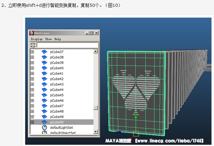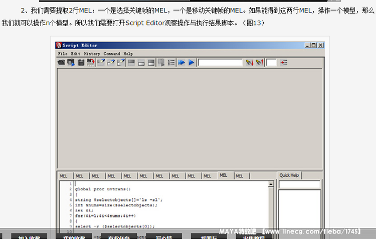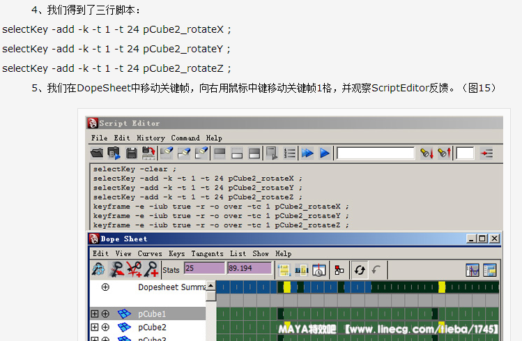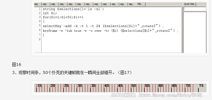 6、我们又得到3行脚本:keyframe -e -iub true -r -o over -tc 1 pCube2_rotateX ;keyframe -e -iub true -r -o over -tc 1 pCube2_rotateY ;keyframe -e -iub true -r -o over -tc 1 pCube2_rotateZ ;进行MEL筛选与编辑虽然我们通过提取脚本行可以得到一些和移动关键帧相关的指令,但是有一些并不实用,所以我们要进行提取和精炼。1、一下句子中X轴和Y轴虽然有动画,但是并没有用。有用的是我们的Z轴动画:selectKey -add -k -t 1 -t 24 pCube2_rotateX ;selectKey -add -k -t 1 -t 24 pCube2_rotateY ;selectKey -add -k -t 1 -t 24 pCube2_rotateZ ;keyframe -e -iub true -r -o over -tc 1 pCube2_rotateX ;keyframe -e -iub true -r -o over -tc 1 pCube2_rotateY ;keyframe -e -iub true -r -o over -tc 1 pCube2_rotateZ ;所以我们要对其进行精简。可以精简为:selectKey -add -k -t 1 -t 24 pCube2_rotateZ ;keyframe -e -iub true -r -o over -tc 1 pCube2_rotateZ ;只保留这两句即可。2、selectKey -add -k -t 1 -t 24 pCube2_rotateZ ;keyframe -e -iub true -r -o over -tc 1 pCube2_rotateZ ;通过脚本分析,我们可以看到,以上脚本只是对pCube2这个物体的旋转Z轴进行操作,并没有通用性,所以我们需要借助循环语法for来进行操作。//For循环基本语法int $i;for($i=起始;$i结束;$i++){做什么事;}3、因为我们要对选择物体操作,所以需要进行字符串数组控制语法string $selections[]=`ls -sl`;之后我们直接提取$selections[$i]变量就可以了。4、进行整合就是string $selections[]=`ls -sl`;int $i;for($i=1;$i50;$i++){selectKey -add -k -t 1 -t 24 pCube2_rotateZ ;keyframe -e -iub true -r -o over -tc 1 pCube2_rotateZ ;}这样虽然嵌套成功,但是并没有让pCube2这个物体变成变量操作,所以我们要对脚本进行修改.将pCube2_rotateZ变成通配属性($selections[$i]+”_rotateZ”),这样$i在循环1~50的同时对50个模型也就进行了操作。由于keyframe -e -iub true -r -o over -tc 1 pCube2_rotateZ ;中的1代表做1帧偏移,但是每往后推1个模型,帧数就需要累加1.所以这里就形成了一个n=n+1的状态,但是这并不难解决,我们把1套为$i就可以了,因为$i是变量,从1~50自动变化。经过以上考虑,我们把脚本修改为:string $selections[]=`ls -sl`;int $i;for($i=1;$i50;$i++){selectKey -add -k -t 1 -t 24 ($selections[$i]+”_rotateZ”) ;keyframe -e -iub true -r -o over -tc ($i) ($selections[$i]+”_rotateZ”) ;}最终执行1、在大纲中顺序选择pCuble1到pCube50。2、在Script Editor中输入脚本,并且按ctrl+enter执行。(图16)