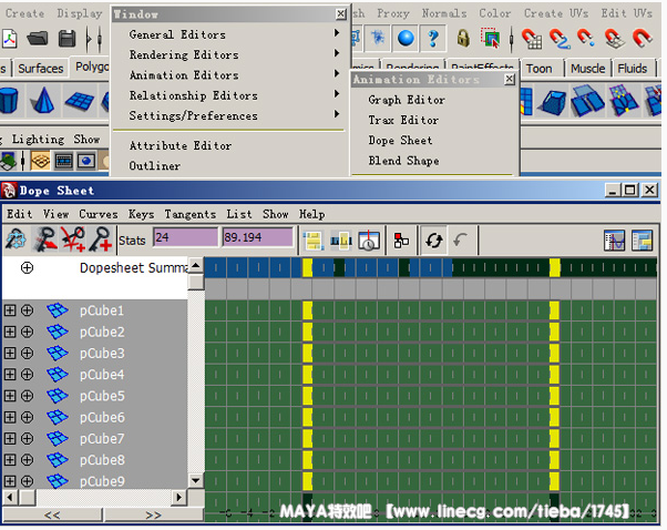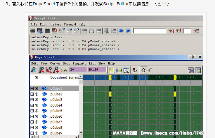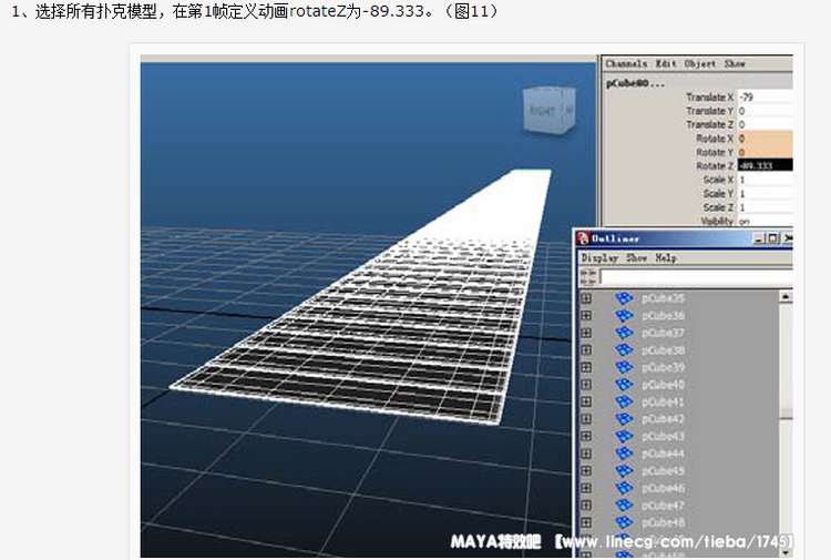 2、选择所有扑克模型,在第24帧定义动画rotateZ为89.333。MEL提取在这里我们的思路是做措关键帧处理。因为关键帧可以在DopeSheet列表中调整,但是50个或者100甚至1000个物体措关键帧的话,一个一个来做并不是明智之举,所以在这里我们选择使用MEL来处理这个问题。1、首先打开DopeSheet菜单,我们会看到如下图所示关键帧列表。(图12)