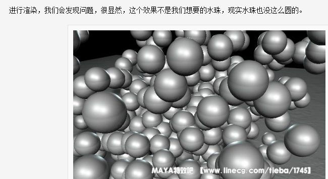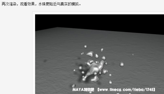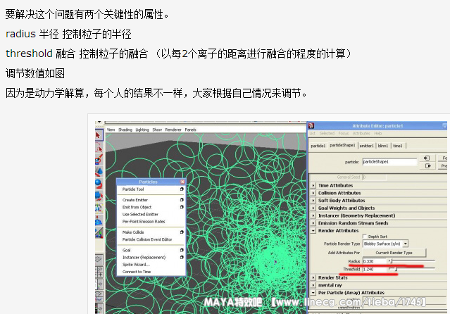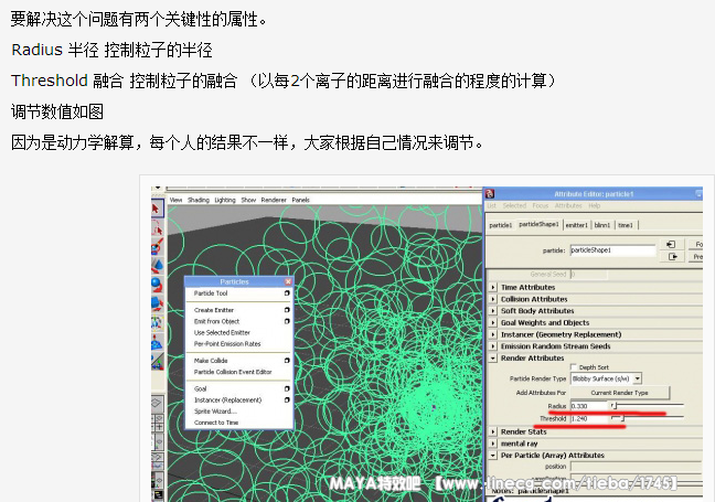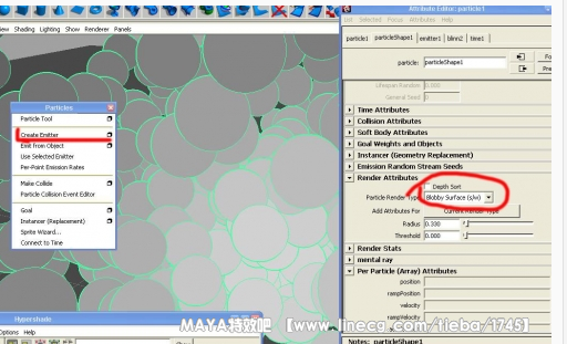 首先在动力学模块下执行CREATE EMITTER创建粒子发射器,用默认设置用动画播放若干帧~大概135帧。 要注意的是,一定要播放每一帧,以达到正确的解算。详细设置在Maya的右下角里。发射出粒子后,我们选择粒子属性面板里的TYPE为BLOBBY SURFACE,后面的S/W表示可以软件渲染。)也就是我们的默认渲染器可以渲染的粒子形态。便于观察,我们赋予粒子一个材质。