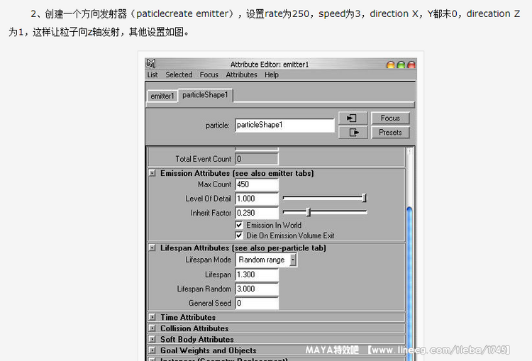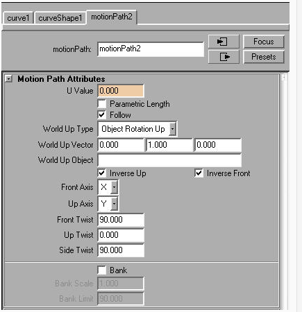 6、将粒子和灯光打成组,并命名为star1,注意粒子和发射器,它们应该在同一位置。然后复制一个命名为star2(复制时记得要在edit\diplucate里面点diplucate input graph,而且在复制时要复制他的父节点即group)。 7、选中star1和curve1在animate(F2)菜单组里面点选animatemotion pathattach to motion path,star2和curve2操作一样。这时我们播放动画可以看到粒子沿着我们指定的路径运动,但是粒子不完全被路径约束,我们我改变他的motion path,点击curve1,弹出属性编辑器,点选motionpath1,设置如下。