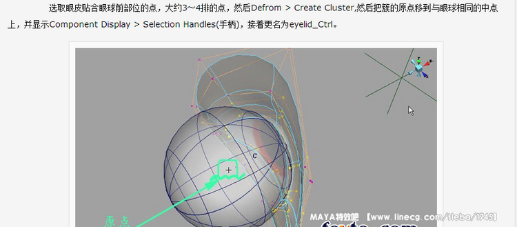 这个方法就是利用 Cluster 和简单表达式实现眼皮眼球联动。看看这个演示是不是很活啊~ 眼球是一个球体,眼皮是贴合并包裹在眼球外的柔软物体。当眼球运动的时候,摩擦作用会影响眼皮,出现微小的联动关系。 Maya中有很多实现这样效果的制作方法,比如混和变形、包裹变形、Drive Key等。但这些制作方法里有些还是比较麻烦的,数据量也大,特别是混和变形,要做好几个混和目标物体,还要把这些Drive Key到操控手柄上,处理起来很繁琐。 我研究了许久,想起了Cluster 能控制模型上的点的这一特点,经过试验制作出模拟眼球眼皮联动的巧妙技巧,不敢独享,特此写上一小篇,与大家共享! 1.建立一个Sphere,更名为Eyeball,跟着建立一个Locator;执行Constrain Aim命令,作为影响眼球视线的物体,做过绑定的都知道,这里不再详述。