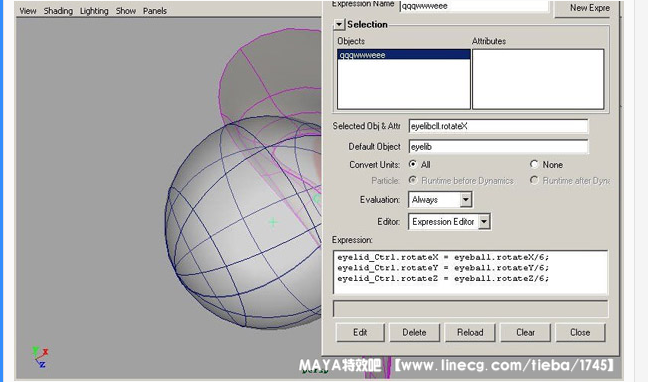 现在我们就要利用非常简单的表达式实现眼球对眼皮的影响!选中eyelid_Ctrl 再打开Expression Editor,在Expression对话框输入以下内容并确定: eyelid_Ctrl.rotateX = eyeball.rotateX/6; eyelid_Ctrl.rotateY = eyeball.rotateY/6; eyelid_Ctrl.rotateZ = eyeball.rotateZ/6; (其中的/6数值是阻尼值,自己试试就知道,可以按自己实际情况调节!)