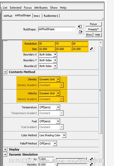 现在暴露出的问题有1. 见《计划效果》中的第一条2. 见《计划效果》中的第三条3. 流体发射器应该发射完墨汁后就停止。4. 墨团形态太规则第一个,密度有一个参数Diffusion可以影响扩散速度,在墨滴滴入水的一刻将此参数K为0.4,随着墨滴沉入水中将此值迅速K小直到0。播放一下看效果。第二个,对shading下的透明度K帧,在墨滴没有扩散的时候K一个很小(暗)的值,到最后K的大(亮)一点,最好透明度的变化能和墨团的体积变化速度符合。第三个,对流体发射器的发射密度K帧,在开始值为15,然后随着时间急剧减小,以很小的值持续一段时间变为0(模拟墨汁的拖尾效果)。第四个,为流体容器添加速度漩涡和扰乱。参数参考图片。Maya几乎任何属性都可以KEY帧,可以看到很多效果是手Key的,一些手Key很容的效果可能用动力学硬解算那可能很麻烦。