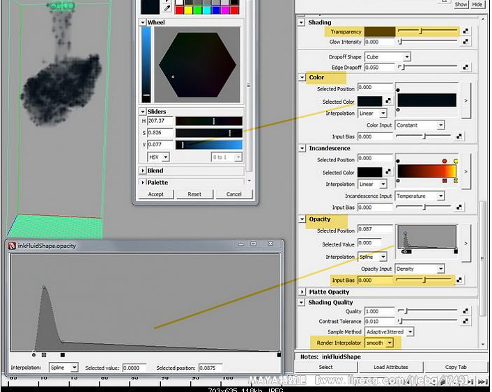 现在最明显也是最容易调节几个属性被我们调好了,调好了这几个,再下面的一些参数可能需要你不断的狠狠点击播放按钮不断的调节来找寻到底哪个值或者哪组值才是最像墨汁的。点开流体容器属性的shading栏,下面我们来调节影响我们做出的是浓烟还是墨汁的灵魂参数Opacity。确认Opacity Input为Density,在Opacity右侧的曲线就表示透明度随密度变化的曲线,密度从左到右越来越大。如果我们做烟雾,需要在烟雾微粒密度大的地方让透明度相应变大,所以曲线应该是增长的线性曲线,而现在我们想做的是墨汁,墨汁在滴入水中后由于&^&*%$什么鸟流体力学原理形成类似像柔软的水母一样的里面是水的形态,所以我们应该把透明度曲线调成类似图中的这种形状。Input Bias用于偏移Opacity Input,也就是最后曲线的横轴为opacity+input bias,如果发现墨团形态太小可以将此值加大,反之调小。现在有那么点样子了,《计划效果》中的第二条和第四条解决。