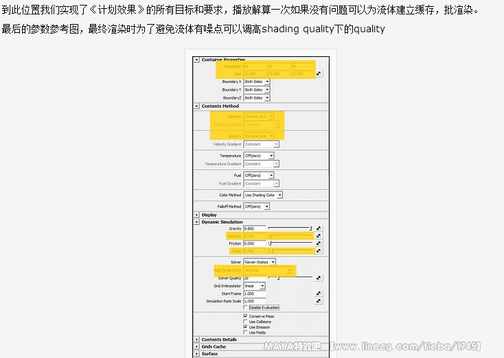 首先我们计划一下一滴墨水滴到水中会发生那些比较独特的效果:1.墨滴刚接触水面时由于表面张力会迅速扩散成环状,然后2.墨水会往下沉3.随着墨汁体积的扩散,整体透明度越来越低4.整个过程中要做出墨融于水时那种飘渺的一缕一缕的效果好啦,我们开始制作吧!首先,创建一个流体容器,也就是“水池”,由于最终墨水的形态是上下长的,所以将其分辨率分别设为30*75*30,体积也设成相同的比率。重点的参数都在图中标出。在动力学解算中我们只需要用到密度和速度,所以在contents method里将density和velocity设为动态,其他的off。然后我们在Dynamic Simulation中将High Detail Solve(高精细节解算)设为All Grids,我的理解是高精解算可以更好维持密度和速度,不至于在体元与体元的传递中失真,这正适合墨水扩散。开启会减慢解算速度,但打开和关闭的效果差别是很明显的。
