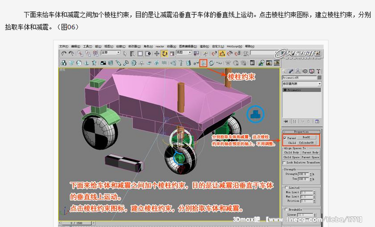 下面为了让车行驶时能转弯做些工作,如图建立一个Box,加入到刚体集合,参数设置如图。点击角度约束图标,建立角度约束,分别拾取建立的Box和前车轮绿色物体,这样绿色物体就受Box的角度约束,根据事先给Box设置旋转动画,就能实现车的转弯了。两个前车轮绿色物体都要和Box建立角度约束,角约束不用加到约束解算器。(图14)