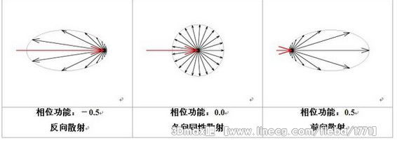下面的一组图片是相位功能为不同值时的示例图,红箭头代表射入物体的光线,黑箭头代表散射光线。