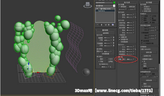 接下来再创建一个重力,重力用球形模式,强度0.1即可,重力放在地面中心,同样是用绑定到空间扭曲的方式将重力链接到粒子,这样粒子就会有一个弧形发射轨迹了。