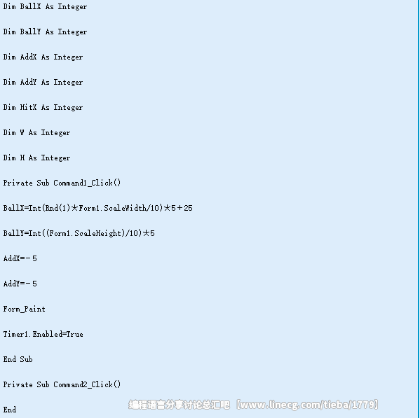 一旦程序代码输入完毕,你就可以按F5开始执行它,或是在File菜单里选取Make来生成EXE执行文件了,瞧,小球已经在你的屏幕上蹦来蹦去了。