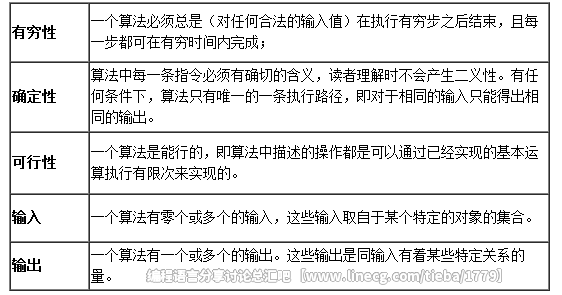 算法是对特定问题求解步骤的一种描述,它是指令的有限序列,其中每一条指令表示一个或多个操作;此外,一个算法还具有下列五个重要特性: