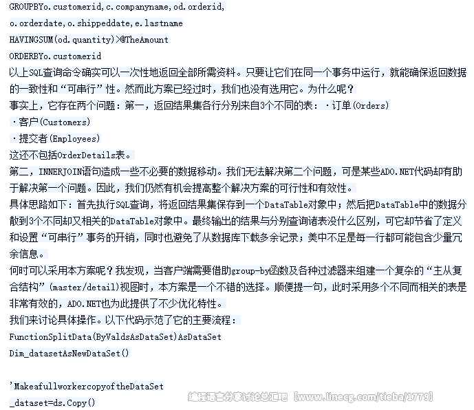 举个例子:你可以把客户(Customers)表与订单(Orders)表分别保存到两个不同的DataTable对象中,然后通过DataRelation对象进行绑定(bind)。这样,SQLServer(或其它DBMS系统)就免除了INNERJOIN子句带来的沉重负担;更重要的是,网络传输负荷也因此而大大减轻。象这样简化SQL查询的方案固然行之有效,却并不一定总是最佳选择,尤其是当你的数据库规模庞大而且更新频繁时。