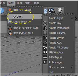 1、在C4D中的位置:主要的工具和对象都在菜单--插件--C4DTOA下:
