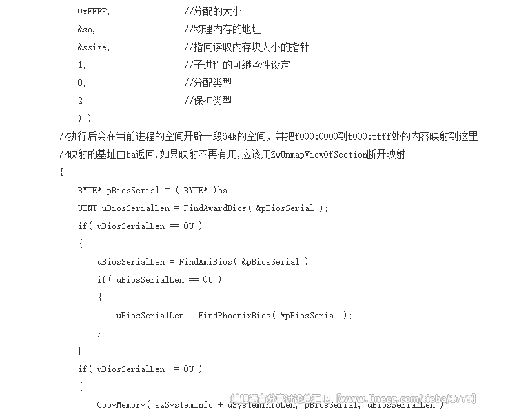 ©2005 黄友生。本文由原作者发布于MSN Space、CSDN。你可以保存、在非商业软件中使用、在非盈利性文章中引用本文中的部分或全部文字,但请注明作者及原文地址。要用于其它用途,请先联系作者(eien@eyou.com)。作者不保证本文完全正确无误、不对因本文中的理论或代码缺陷造成的损失负责。 本文中所有原理及思想均取自网络,有修改。其中获取硬盘序列号、获取CPU编号、获取BIOS编号的原始代码的著作权归各自作者所有。