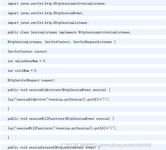简言之,如果不用第三方提供的接口 那最好的解决方案应该是当SESSION建立时sessionCreated(),在访问总数和当前在线人数上+1 当SESSION销毁时sessionDistroyed(),在线人数-1 核心方法是利用Listener监听的各种接口 我把代码(主要部分)贴在下面 此段代码我亲自使用过,没有问题 但因为继承了接口,有些未使用的方法也要补充进去,具体方式比如在MyEclipse中可以靠点错误,ADD UNIMPLEMENTED METHOD实现