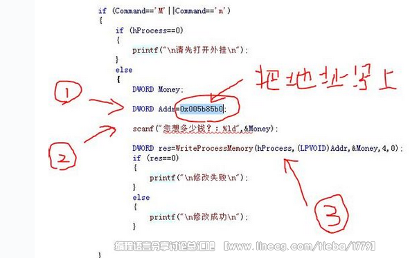 那好笔把地址抄下吧,这个就是金钱的地址,打个比方就是抢银行时银行金库的位置,回到VC继续编程,可以看到我们又定义了三个变量DWORD,一个呢就是钱的数目,一个呢记录地址,