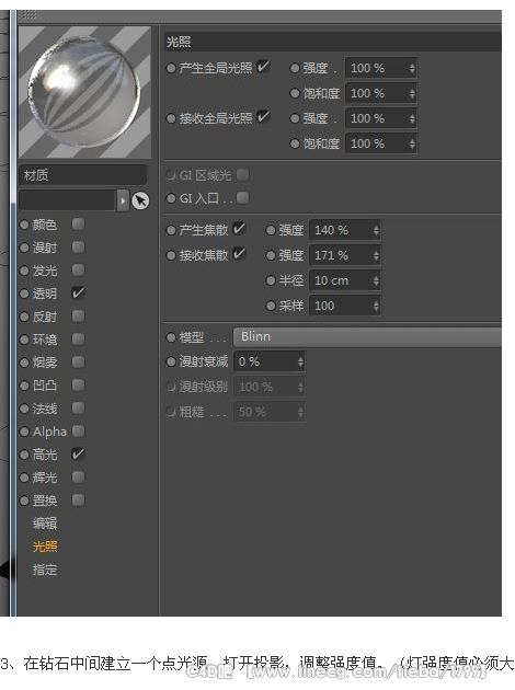 2、要想出焦散效果,在材质、灯光、渲染都要设置。