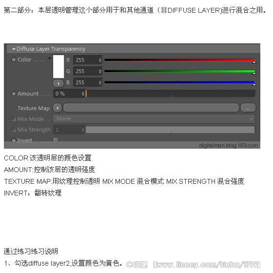 通道这个部分可以为材质设置基础颜色或材质。材质纹理权重比颜色大(材质纹理在颜色的上面)如果二者都设定,而MIX MODE混合模式是NONE(无)的时候,材质纹理将全部覆盖颜色,就是说颜色再设也没用,会被纹理覆盖掉。如果二者都设置,在MIX MODE混合模式ADD或其他,调整MIX STENGTH(混合强度),颜色和纹理就会按照MIN MODE 算法进行混合。(纹理上色的感觉)