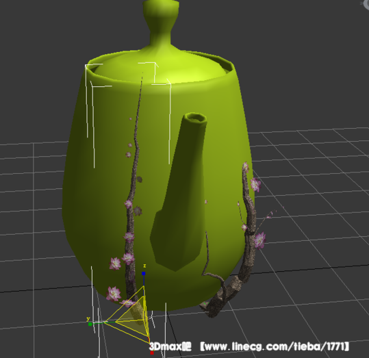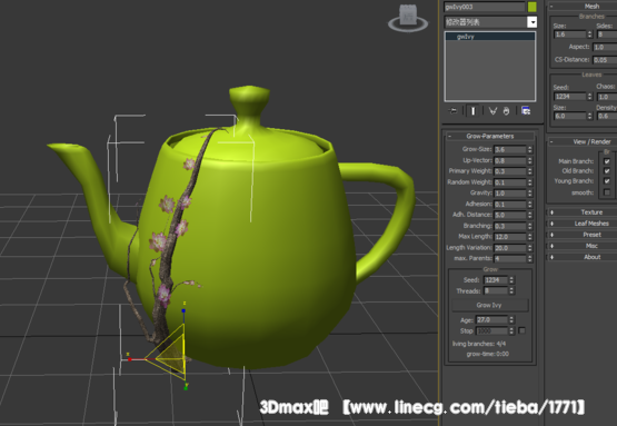 这里用到的是常春藤生成插件,先创建一个茶壶,然后在茶壶底部创建常春藤,直接生成就会沿着茶壶向上爬,非常傻瓜的东西,然后把树叶的贴图换成了一个花瓣的。