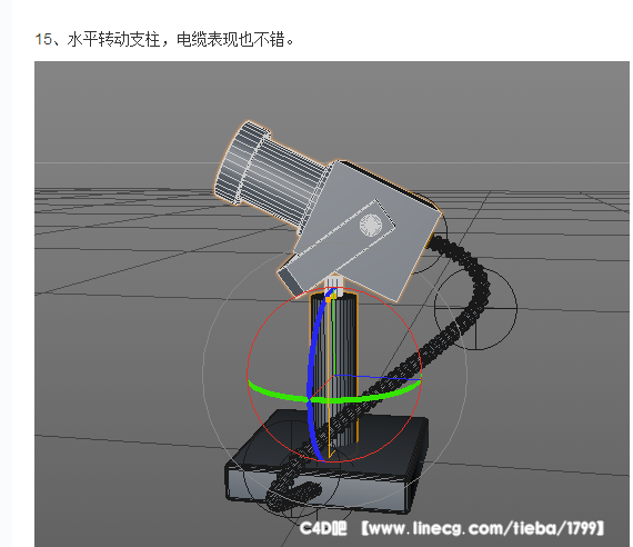 2、我过去看到老外制作相应的一个教程,但是他制作的电缆,用的是毛发标签中的样条动力学,然后把机身和底座都设为刚体,再用约束去固定两端,制作动画的时候,必须点击播放,开始模拟,否则没有效果。如果对其姿态不满意,只能调节动力学参数和重力等,及其不方便。